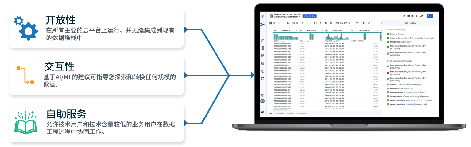 Trifacta数据工程云,数据工程师和分析师都可以在该平台上协作分析,使用无代码/低代码可视化用户界面大规模自动化数据管道