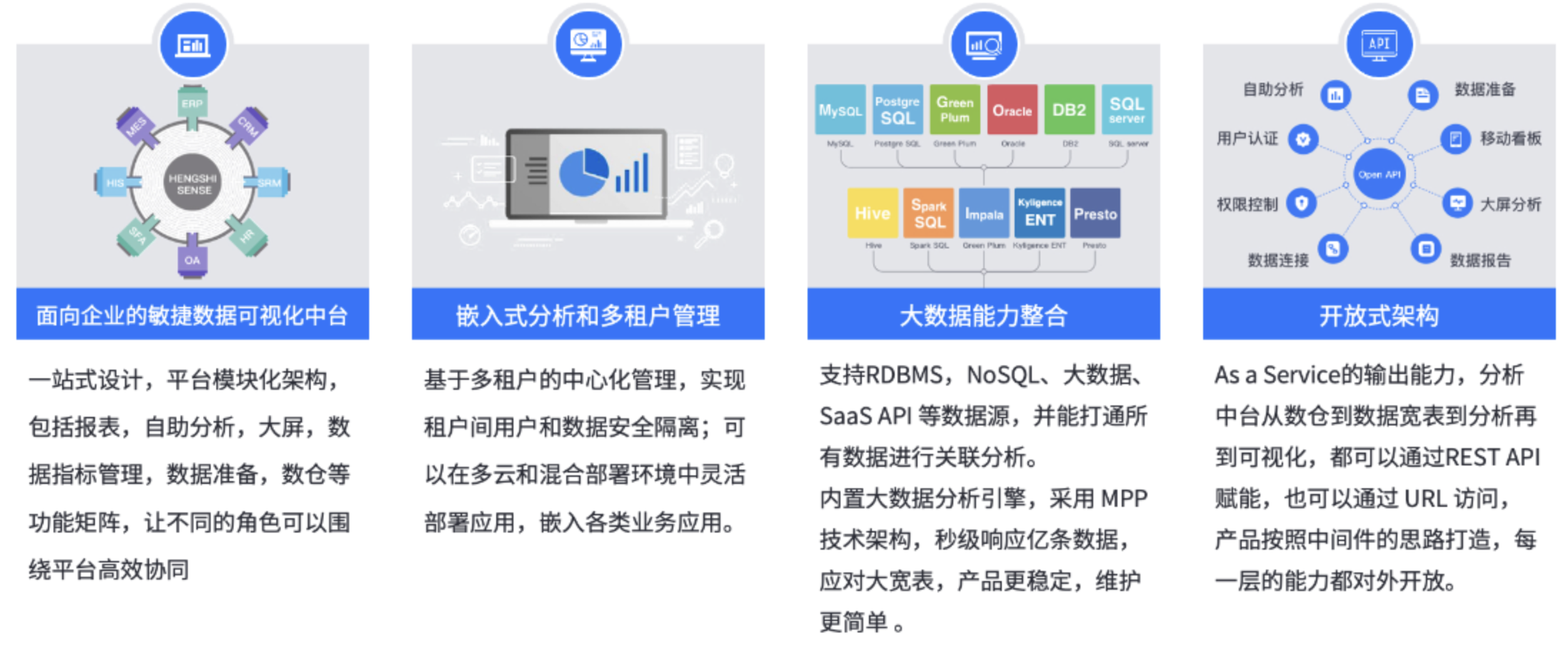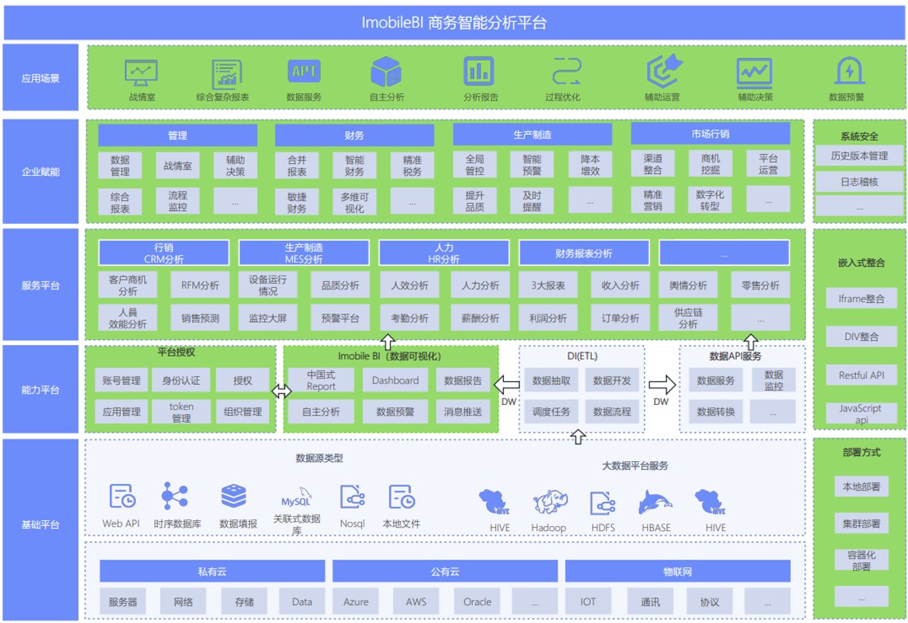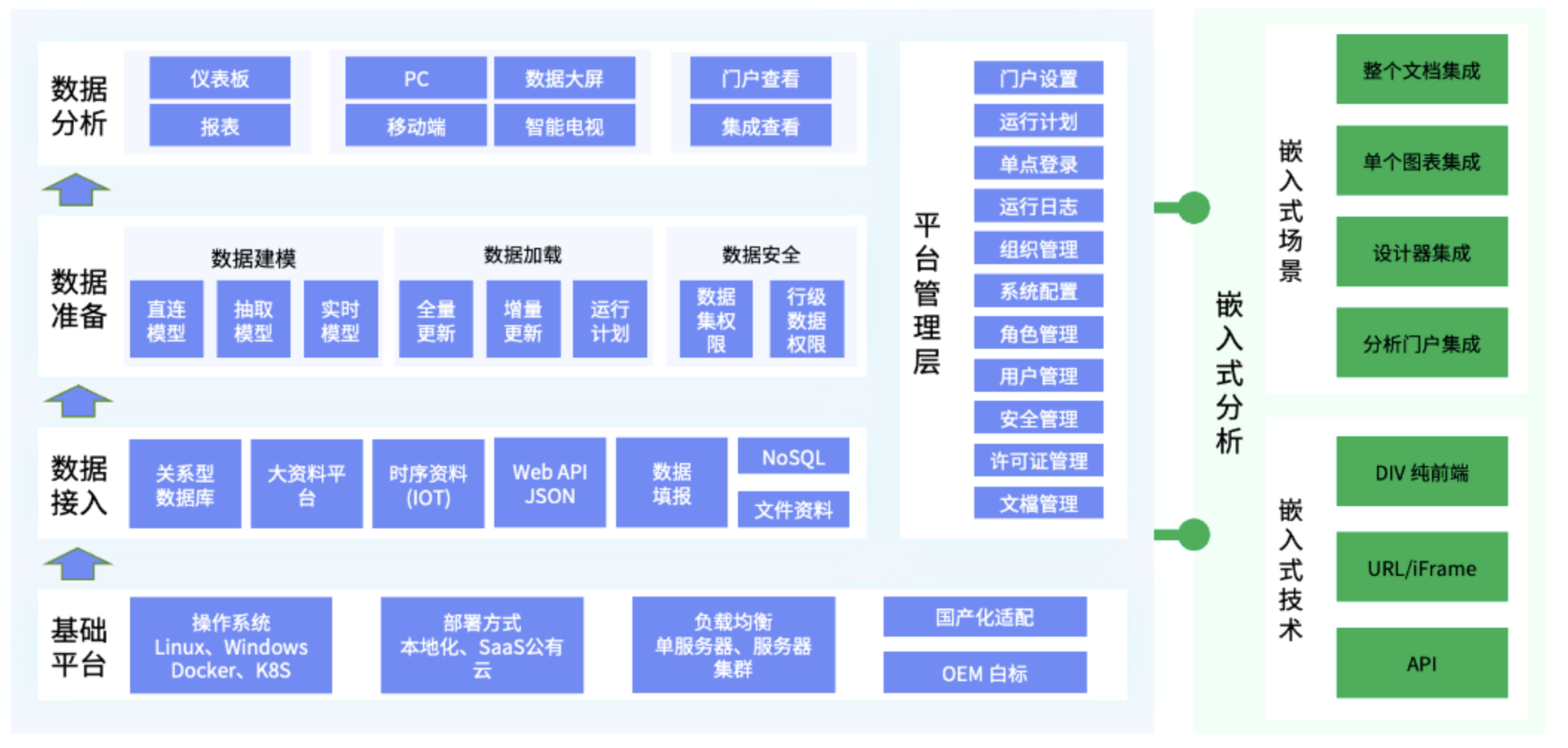 摩柏BI产品整体架构基于企业级应用设计,提供数据分析平台的全部功能,全面支持平台、数据库的国产化,提供单机部署、分布式部署、K8s部署多种灵活的部署方式,满足企业级高并发、大数据量分析的需要