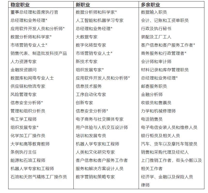 Note: 用*标记的职业出现在多个列中,这反映了这些职业也许在某个行业中的需求稳定或呈下降趋势,而在另外的行业中是受欢迎的。