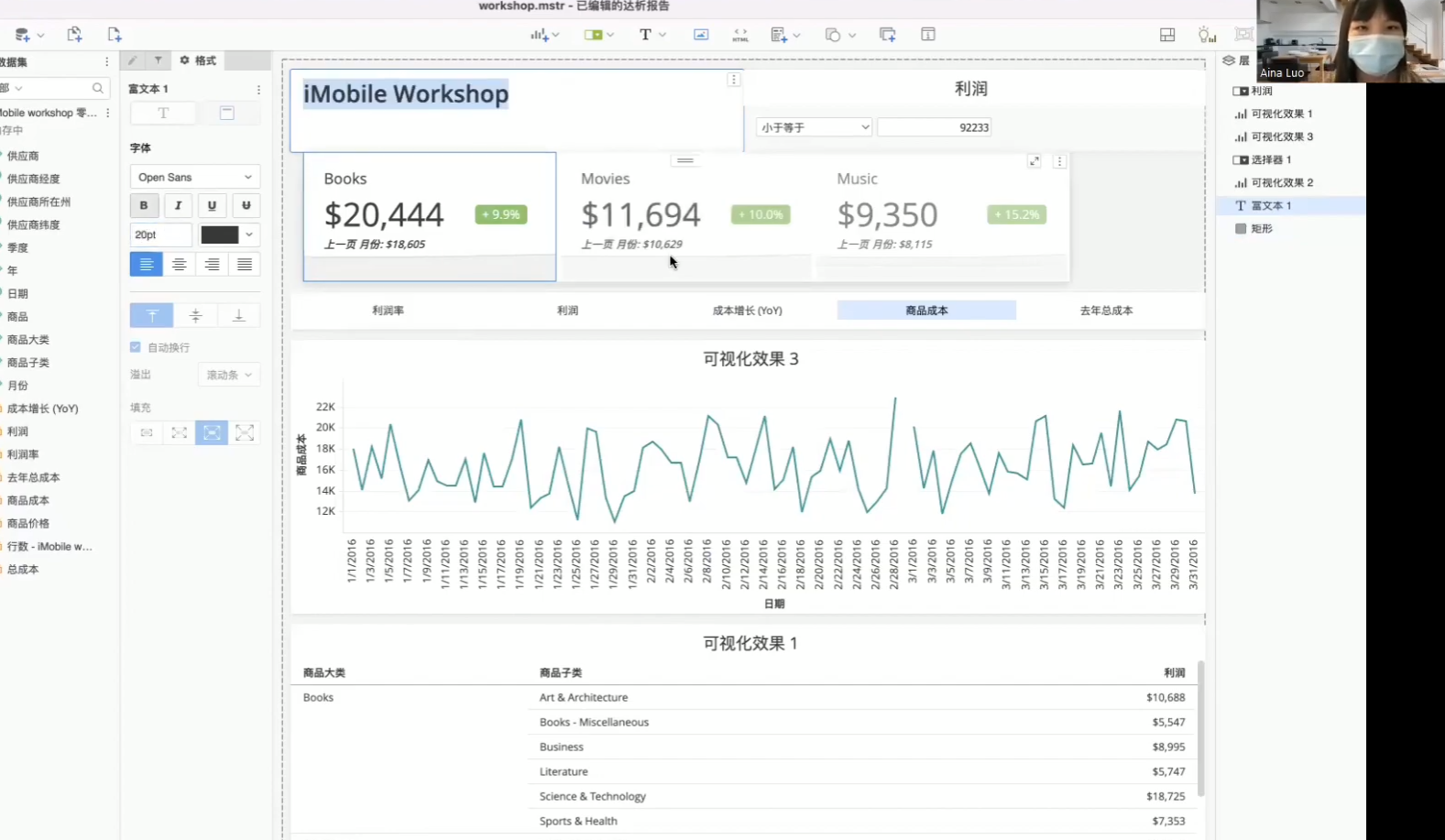 理解零售业应用BI的实际案例后,课程接下来将引导学员制作属于他们的第一张仪表板,Aina采取以MSTR实际DEMO的形式,让学员可以直观感受到数据从EXCEL排排站的形式直接转为多元图表的过程。也透过画面直接演示不同图表呈现的重点跟注意事项,将课程资讯落实于实战的分享方式,让学员更迅速理解数据分析的重要性。