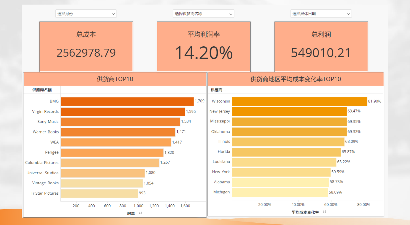 上图为此次学员分组《联大梦之队》得奖作品部分页面,学员透过原始数据整理出供应商销售状况,定时观察供应商销售前10名,也可透过MSTR的关联分析找出其他核心要素的影响,进一步去优化后续针对经销商的销售策略。