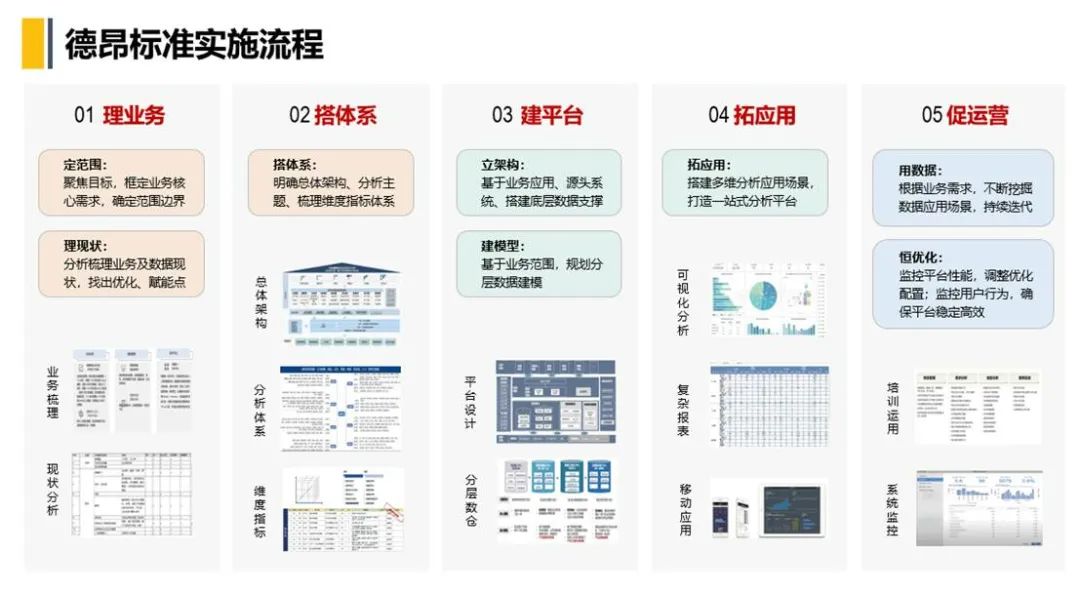 德昂标准实施流程全面且系统,从业务梳理到体系搭建,为企业提供清晰的数据管理方向。通过平台建设和应用拓展,助力企业打造一站式分析平台,实现多维数据分析场景。我们更加注重运营优化,通过监控和调整确保平台稳定高效,持续迭代数据应用以满足业务需求。