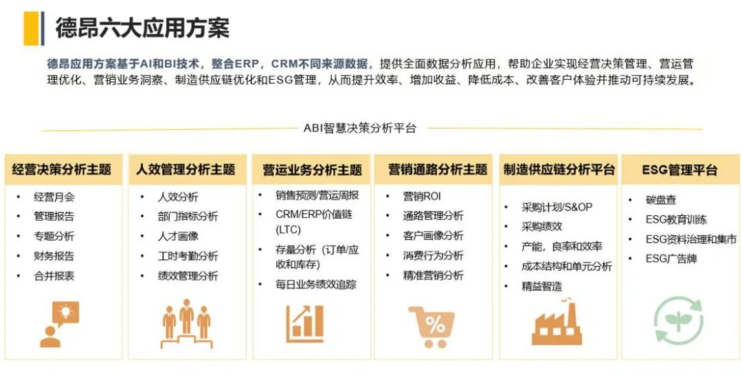 基于AI和BI技术,整合ERP、CRM不同来源数据,我们的六大应用方案将进一步助力企业发展。