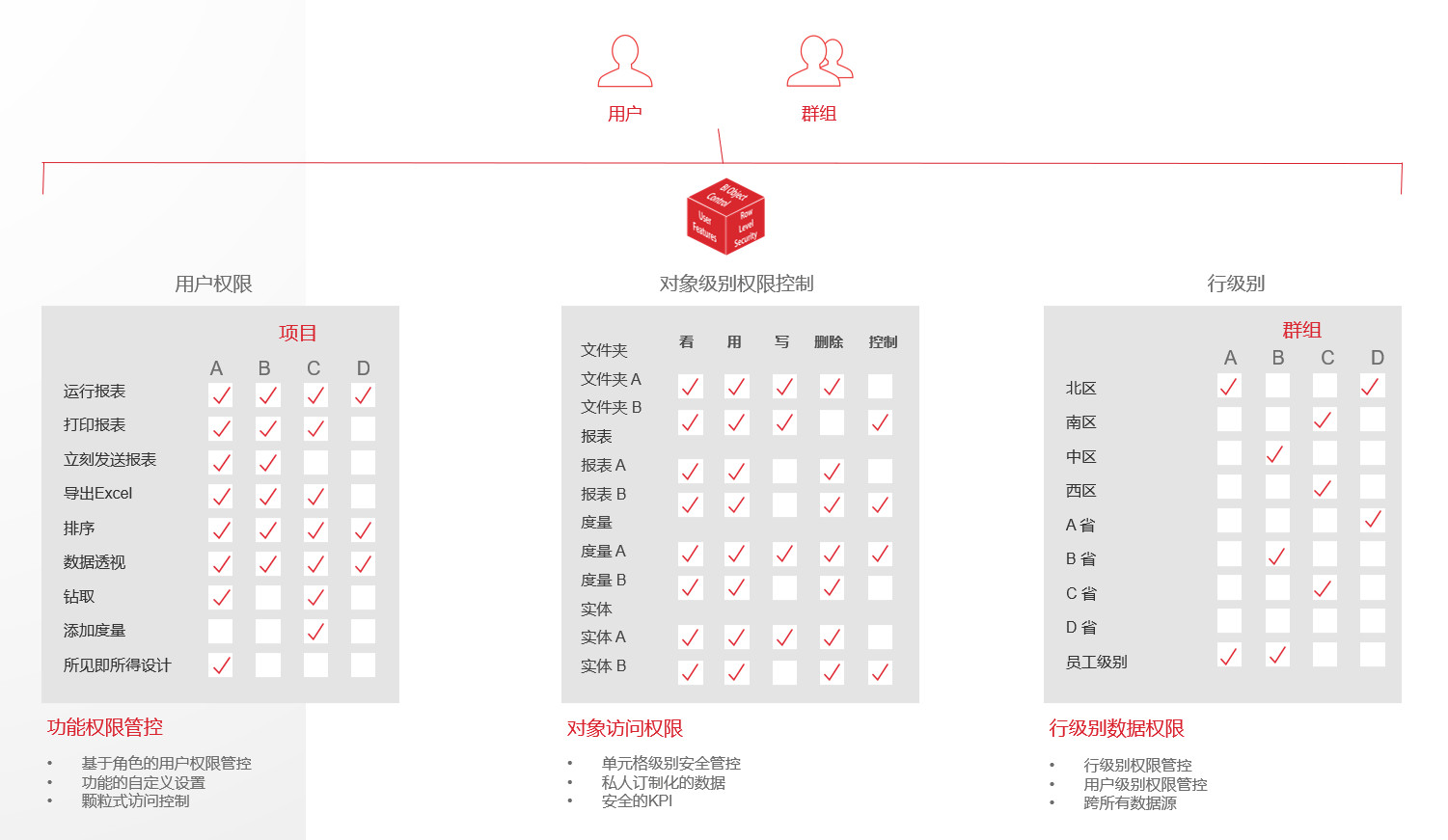 比如同一个报表,有的用户只能看A部门的数据,有的用户只能看B部门的数据,同时作用到下游所有引用的数据集、报表和仪表板等应用,不需要针对某个数据集或者某个报表额外配置权限。