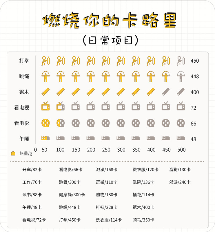 你想减去一磅的体重,你要“燃烧”多少卡路里?答案是3500个卡路里。换言之,若你每日能成功燃烧500个卡路里,理论上一星期后你可减去一磅的体重! 以下是以体重68公斤,运动一小时为例计,其他体重依比例增减,体重越重,你所消耗的卡路里份量就越高。让我们看一下,什么运动可以消耗能量吧!