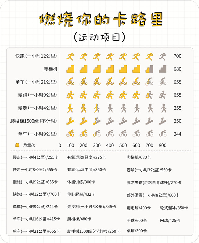 第二步就是根据能量表进行运动和食物的搭配。选取自己喜爱的食物和经常做的运动是很重要的。对我们来说,可以按照自己的喜好和可执行性来选择运动种类,这样就少了很多不想运动的借口啦~不过小编预测,跑步与健身依旧会是大热的选项,你同意吗?