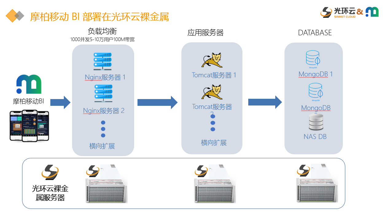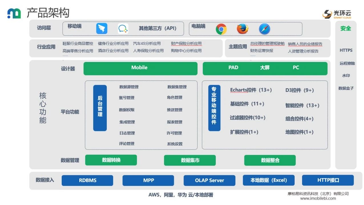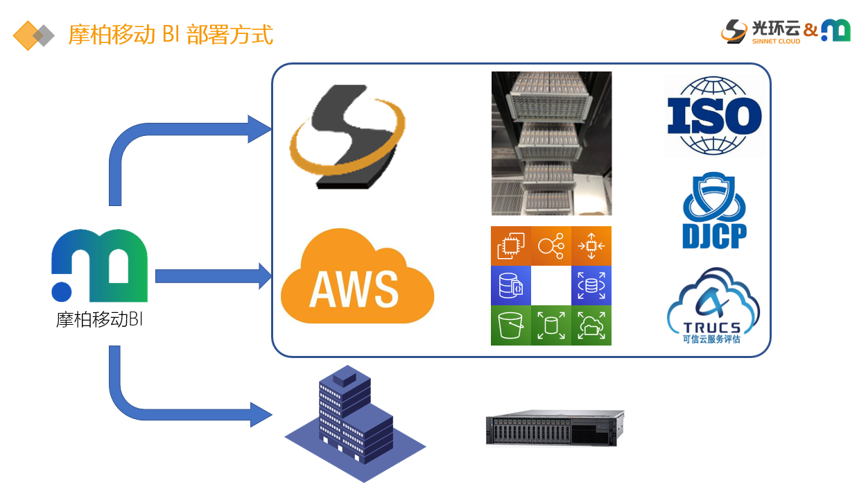 我们知道,移动BI要处理大量的业务数据,同时需要实现随时随地的访问和获取。因此,移动BI需要借助云计算相关的技术来完成部署。前面我们已经提到,摩柏移动BI支持公有云部署和私有云部署,那么在这个过程中,光环云都能提供哪些产品和服务呢?