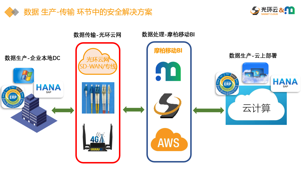如果企业的数据生产是在传统的企业数据中心的话,例如桌面应用、ERP、SAP等企业业务应用所产生的数据,那么就需要通过安全稳定的专用线路,将数据上传到在云上所构建的BI数据处理平台当中。对此,光环云的云网产品线,提供专线和SD-WAN两种解决方案。