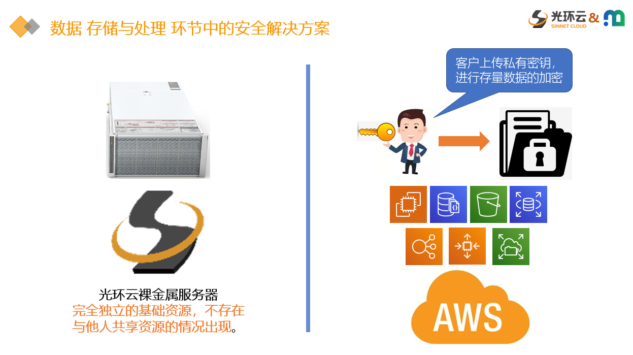在数据的存储与处理环节上,客户可以使用光环云的裸金属服务器和AWS公有云来完成数据的存储与处理方面的工作。