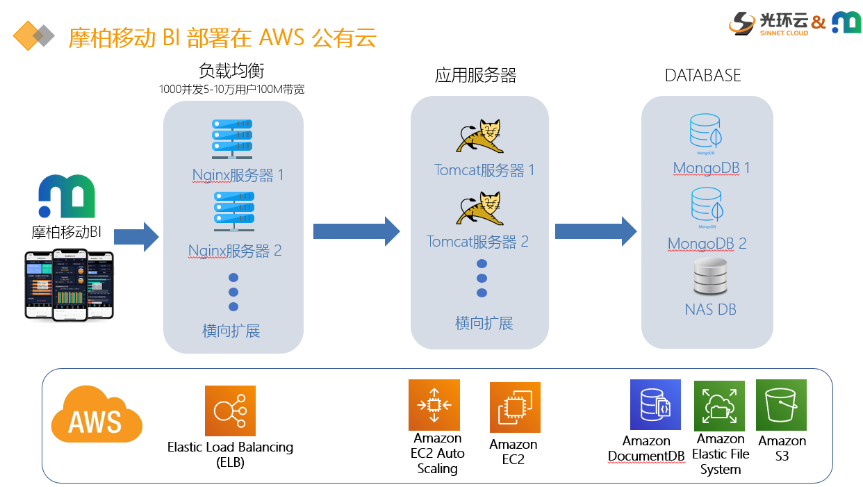 如果刚刚提到的那些企业业务应用,客户已经部署在AWS云上,就可以和摩柏BI进行无缝对接。光环云也可以为客户提供咨询和技术方面的支持。