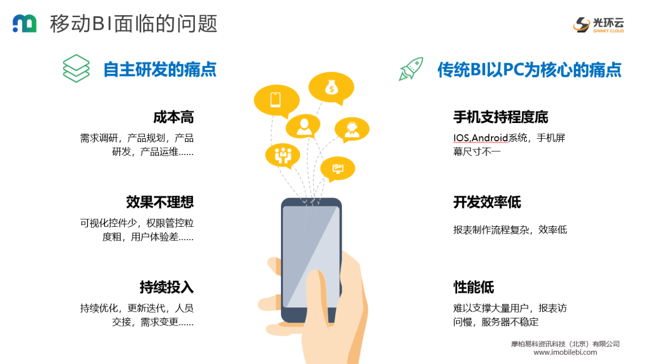 BI对企业来说是很重要的工具,依托报表工具或BI可以在不同层面上帮助企业实现管理决策的目标,但是企业自研BI存在成本高、效果不理想、且持续投入等问题。传统的PC端BI对手机的支持程度低,开发效率低,性能低,已经无法适应移动互联网时代的企业。于是,移动BI逐渐成为BI主流。