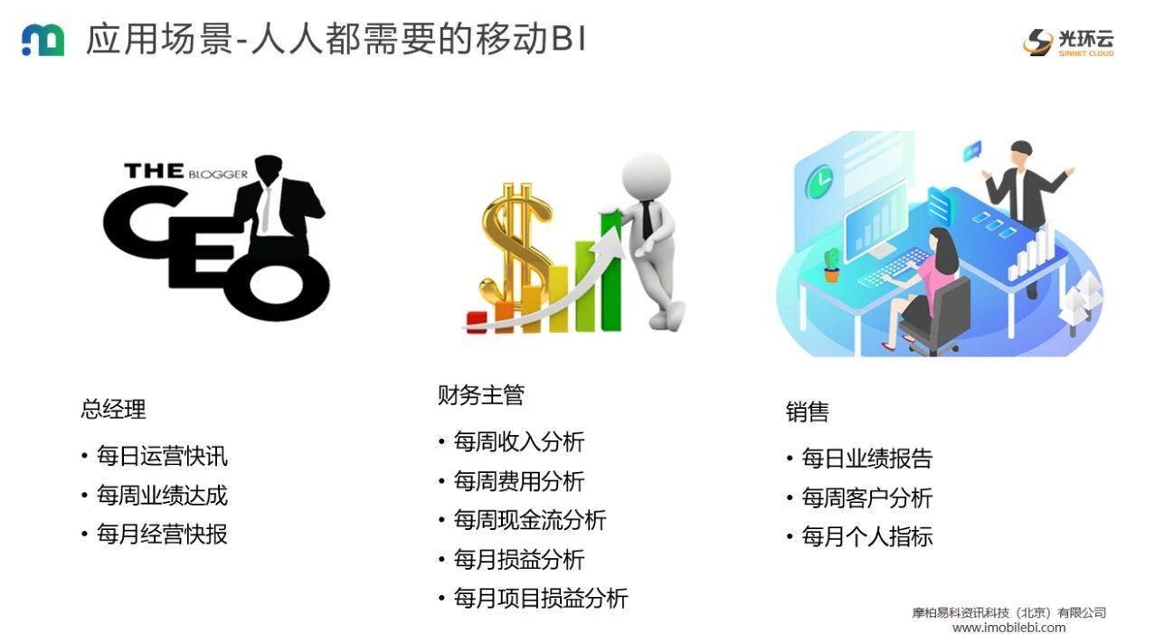 企业中,人人都需要移动BI,无论是总经理、财务人员、还是销售人员等,都是移动BI的主力使用者。以数据为驱动,时时刻刻关注企业运营相关数据,辅助业务管理决策。