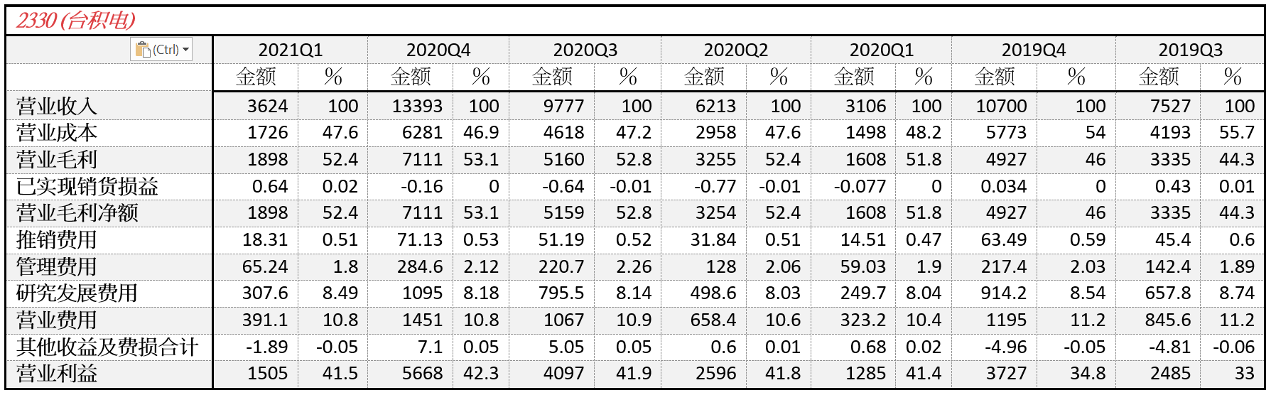 以台积电来说,各季度的营业毛利净额比率差异不大,但单看2020第三季度的表现相对优异于去年同期。好的财报分析必须同时运用静态及动态分析手法。