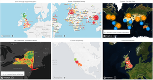 可在地图上将气泡显示为标记、显示密度地图、显示区域地图、资料库阈值的颜色代号、将地图用做是筛选器、将地图作为目标、在视觉化探索中查看地 图、显示数据等。