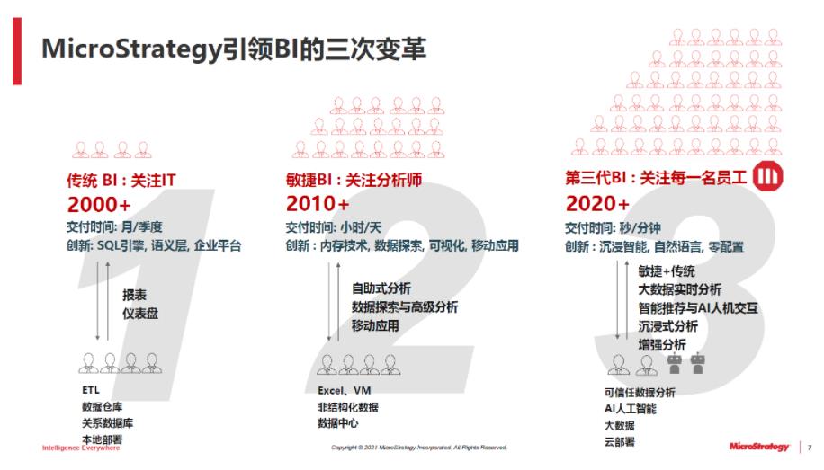 2000年时,使用传统BI、用建模的方式,来建立报告。到了2010年,开始做自助式报表。2020年后,Microstrategy将BI做到有强韧的底层数据平台支撑,并能同时满足业务等非IT人员用户,充分地将数据灵活运用在不同的场景,也成就Microstrategy在BI行业的定位:真正符合敏捷与传统于一身的企业级BI平台,并在BI市场上建立无法撼动地位。