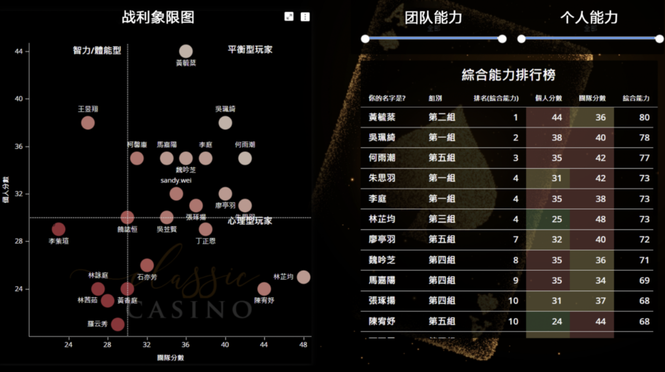 久违的线下黑客松在学生高达90分的满意度中落幕了,整体课程设计也因教学方式不同做了大幅度的更动,除了手把手带领学生快速经历专案的拆解、规划、开发与结论外,也额外透过延伸指标与量化教学,让学生可以针对数据分析有更深层的理解。其中也带入了德昂的核心概念—MVDA,透过选择一个子主题,无论是在数据处理或画面开发,都可以透过快速导入与学习。最后也顺应时势,实际透过学生的量化问卷,将资讯快速取代资料,计算出学生在时下流行的影集今际之国中的生存机率,加深整体课程的应用与带入感,让课程在高峰时画下句点。