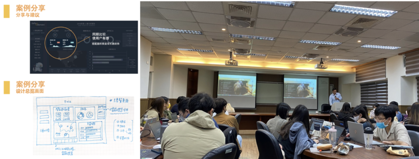 当故事篇章已跃然于纸上,随着课程推进,我们也步步带领学生踏入数据的世界,藉由资料集的说明,对于指标与度量定义的理清,通过一问一答,让学生可以快速判断出人力资源领域中各个资料格式与应用方式。紧接着以原厂分享的可视化理论带到可视化应用,根据你手中的数据和目的选择合适图表来传达你的理念。在了解资料格式与可视化方式后,第一堂课的最后,我们以实际的人资模组画面,拆解画面设计的SOP,并藉由手绘稿与实际画面的对照,让同学快速理解设计目的与思路。