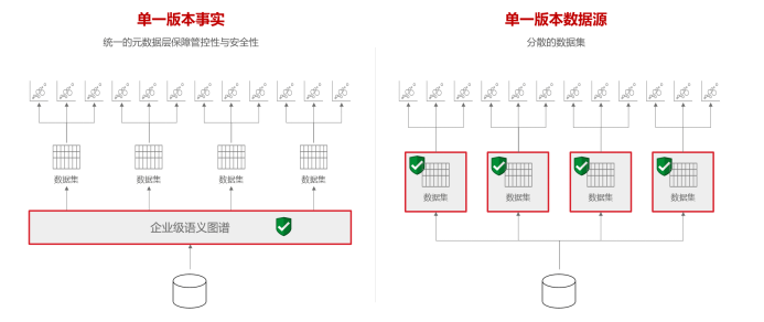BI平台中的语义层一般由IT 部门建设,对业务用户而言,有时语义层的更新不够及时,过程相对较长。因此后来发展的敏捷BI工具,比如PowerBI、Tableau,在逐渐简化中间语义层的处理环节,基于数据源直接搭建数据集,再基于数据集来做可视化分析。这种方式称为【单一版本数据源】。