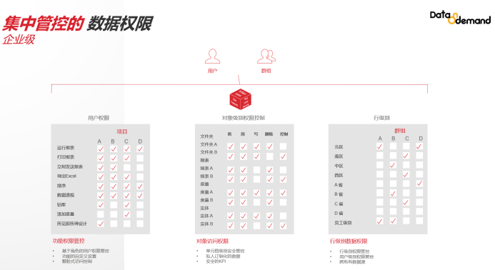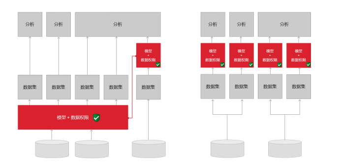 基于语义层可实现集中的权限管控,尤其是行列级别的数据权限设置,非常方便。比如同一个报表,有的用户只能看A部门的数据,有的用户只能看B部门的数据,同时作用到下游所有引用的数据集、报表和仪表板等应用,不需要针对某个数据集或者某个报表额外配置权限。