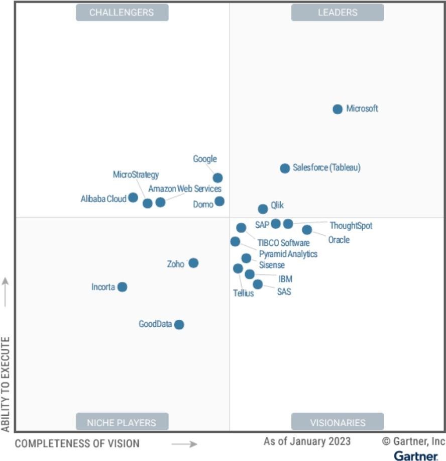结合Gartner测评结果,综合来看,如今全球市场上具有竞争力的BI产品包括Microsoft(PowerBI)、MicroStrategy、Salesforce(Tableau)、Qlik、Alibaba Cloud等,下面将从不同的维度对这些具有较强竞争力的产品进行详细分析。