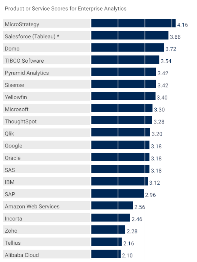 MicroStrategy在企业分析用例中的表现突出,排名第一,是企业级BI的首选。