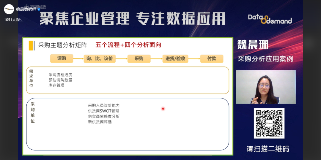 德昂需求分析师、数据分析师晨珊为我们带来了采购案例的分享,她先介绍了采购的概念以及采购的流程,而后介绍了组织层面的经营监控体系和采购主题的分析矩阵,展示了报表案例的DEMO,结合真实案例生动地诠释了如何利用BI做好采购。