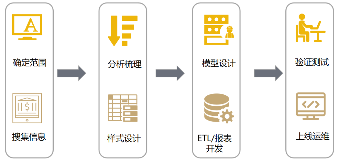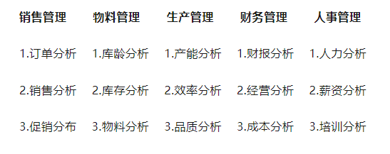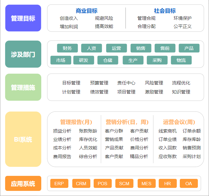 商业智能(Business Intelligence,BI)在信息时代扮演着至关重要的角色。BI的核心目标是协助企业建立一个高度整合和自动化的管理决策分析系统,企业各层级各部门人员基于统一的业务理解和洞察,高效推进沟通和协作,能及时发现问题,并分析过往预见未来。BI包括决策支持、管理驾驶舱、仪表盘、数据可视化、多维分析、数据整合、数据仓库、数据集市、全数据、大数据等。它代表着一套综合的技术、工具和方法,通过收集、整理、分析和展示,将重要数据用报表或统计图的形式展示出来。企业为达到利润最大化,管理者需协调各职能部门,让各部门齐心协力地创造收入,节约成本,提高效能,把控风险。为保证流程一致性并收集作业环节中的所有资料,企业引入了CRM、ERP、MES、HR、OA等业务系统;为更好保证目标达成,引入了各种管理措施包含KPI,MBO和OKR管理、计划管理(包含预算和预测)、绩效管理、CMMI、ISO流程标准等。1、业务需求分析