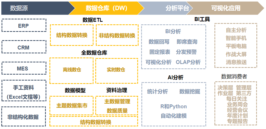数据是BI的基础,没有数据一切只是空谈!BI从不同数据源中提取数据,如ERP、CRM、MES、手工资料Excel文档等。这些底层数据,通过ETL工具抽取到数仓中进行分层加工处理,最后进行可视化展示。