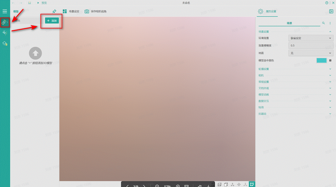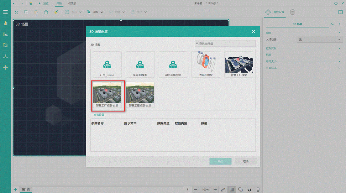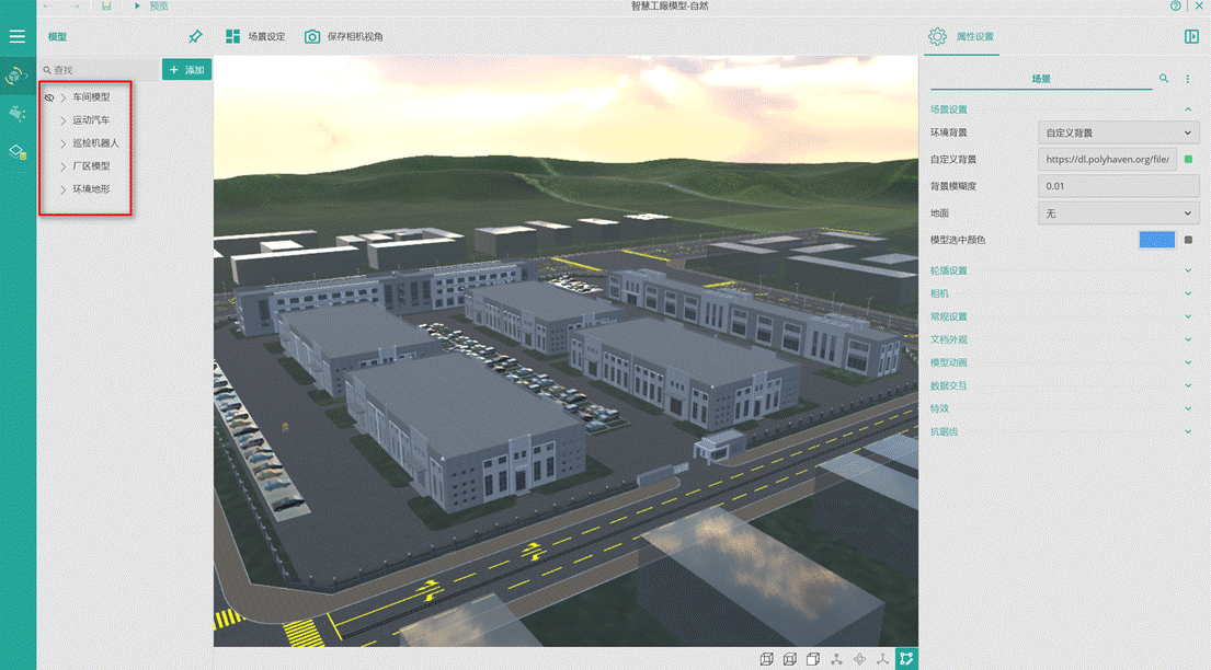 进入3D场景设计器,选择使用的3D模型,可以选择多个3D模型叠加展示。案例演示中使用了车间模型、运动汽车、巡检机器人、厂区模型和环境地形。