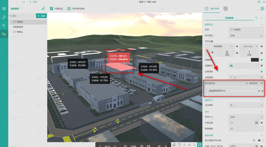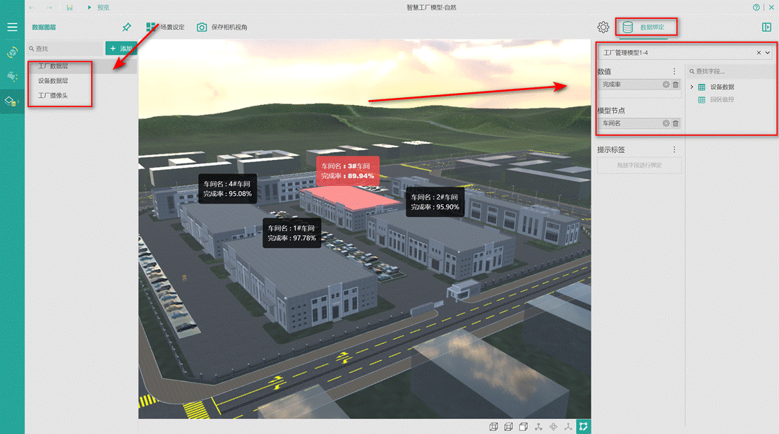 将数据与3D模型进行关联。在数据图层设置中,添加数据图层并绑定数据集/数据模型。在同一个3D场景中可以添加多个数据图层,展示不同数据集中的数据。案例演示中,创建了三个数据图层,分别绑定三个数据集,展示设备生产数据,摄像头数据,温度传感器数据。