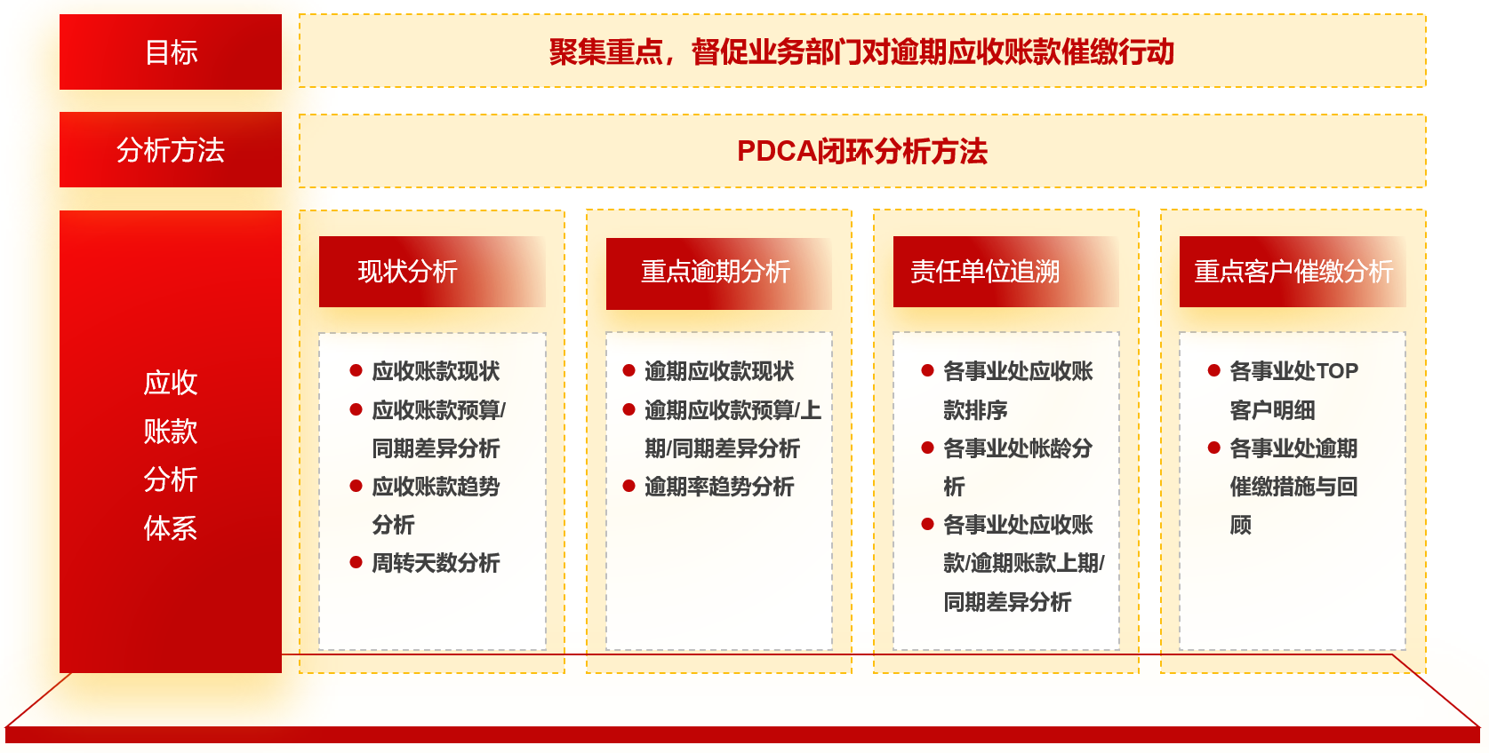 建立的应收账款指标体系为应收账款分析体系提供内容输入。聚焦于管理逾期应收账款金额这一重点,督促业务部门对逾期应收账款催缴行动的目标,采用PDCA闭环分析方法,搭建从现状分析 – 重点逾期分析 – 责任单位追溯 – 重点客户催缴分析的应收账款分析体系,助力企业用数据赋能应收管理业务行动。如下图所示: