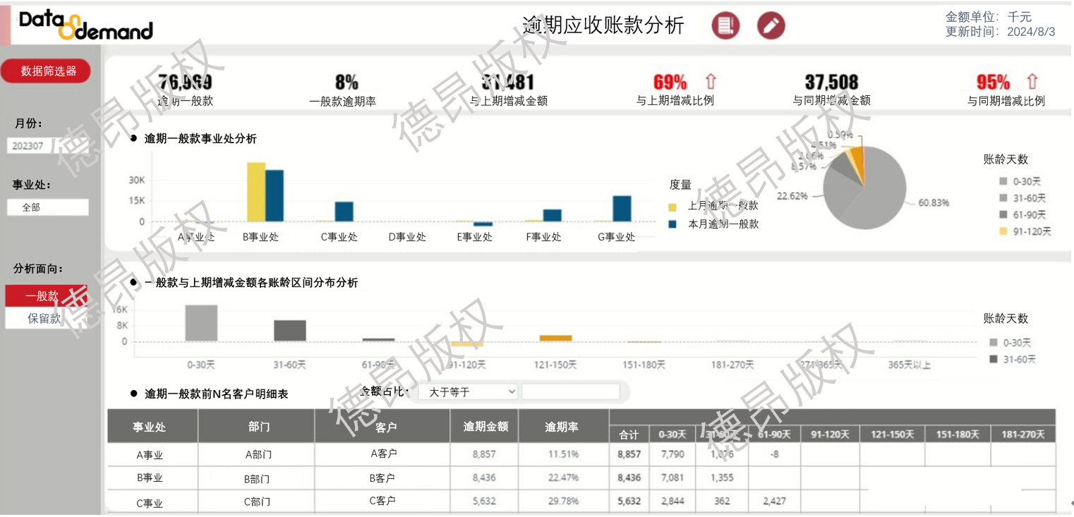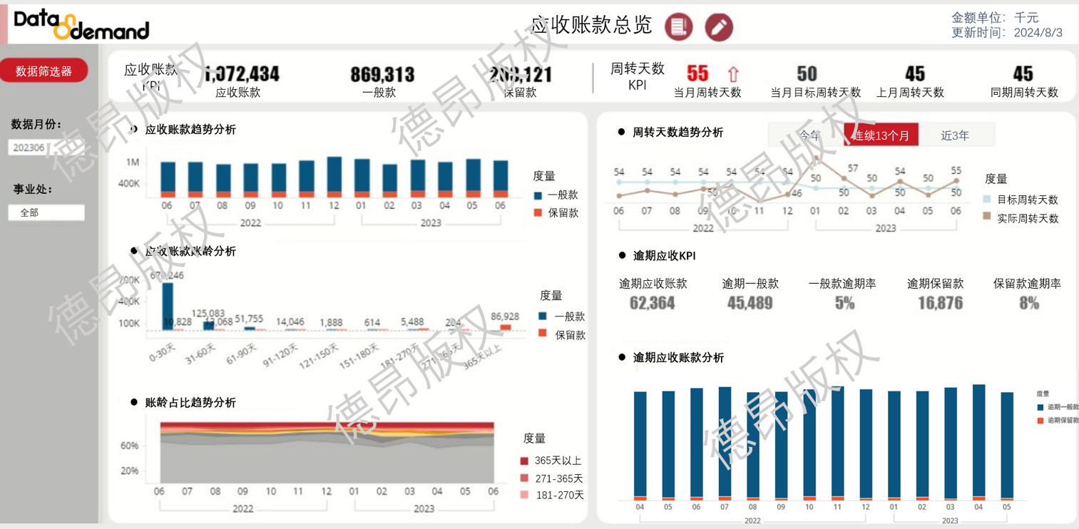 以下是德昂为某品牌制造企业搭建的应收账款分析体系案例,从经营决策层的应收账款总览,管理层的逾期应收账款的重点关注到执行层向客户催缴对策跟进的全生命周期管理。