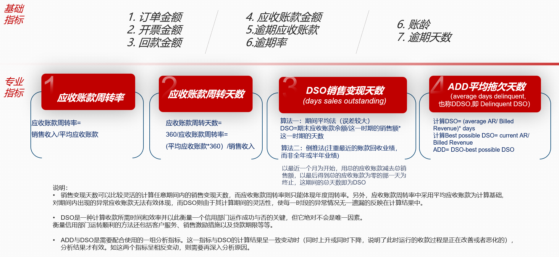 基于应收账款产生的业务流,梳理出各类指标:订单金额、开票金额、回款金额、应收账款金额、逾期应收账款金额、逾期率。同时从衡量企业整体应收账款流动性,又建立应收账款周转率、应收账款周转天数、销售变现天数(DSO)等指标。