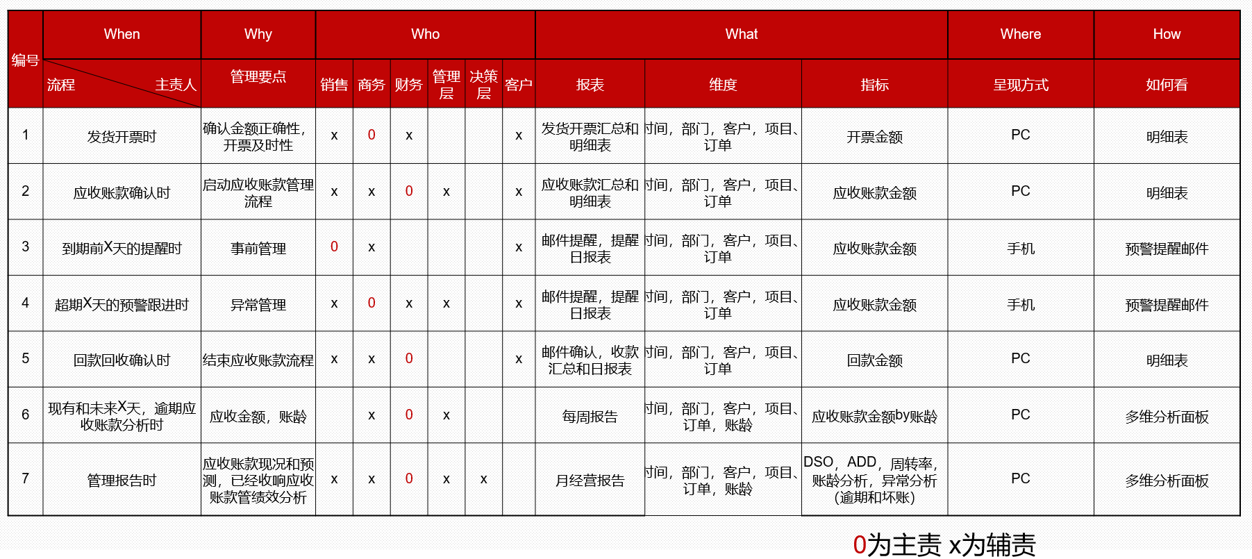 基于5W1H方法,针对不同部门、不同场景搭建起应收账款可视化报表体系,进而用可视化报表支撑各部门密切配合,实现应收账款的有效管理。如下图所示: