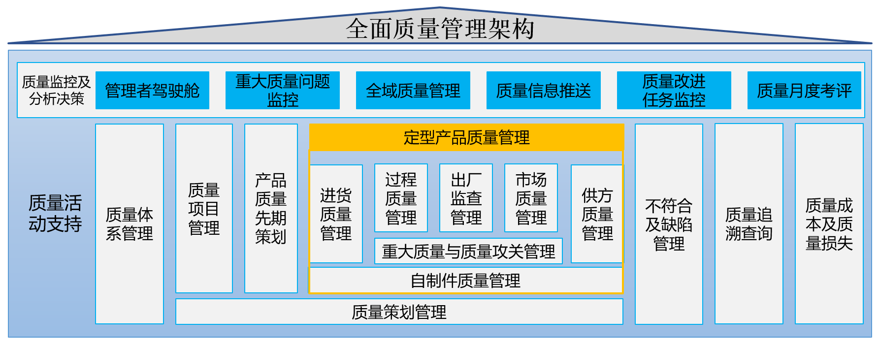 质量管理实际业务模块分为质量体系管理、质量策划管理、质量项目管理、产品质量先期策划,定型产品质量管理(进货质量管理、过程质量管理、出厂监查管理、市场质量管理、供方质量管理、重大质量管理、质量攻关管理和自制件质量管理)、不符合及缺陷管理、质量追溯查询和质量成本及质量损失管理。