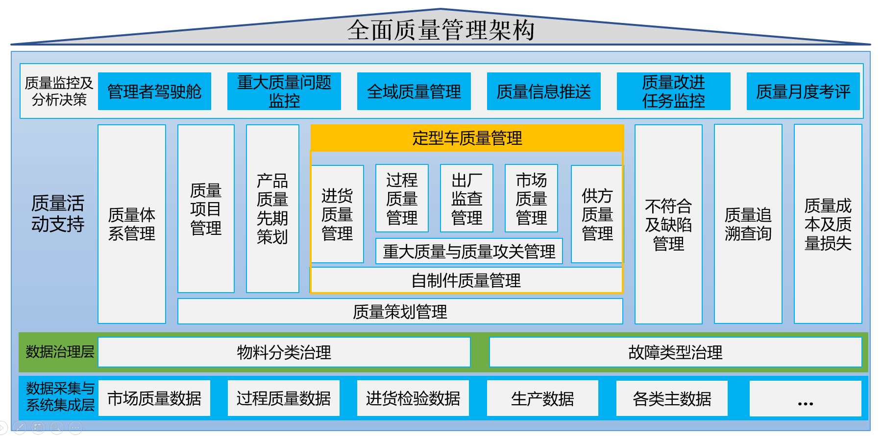 全面质量管理架构分为质量活动支持和质量监控及分析决策两层。具体如下图所示。