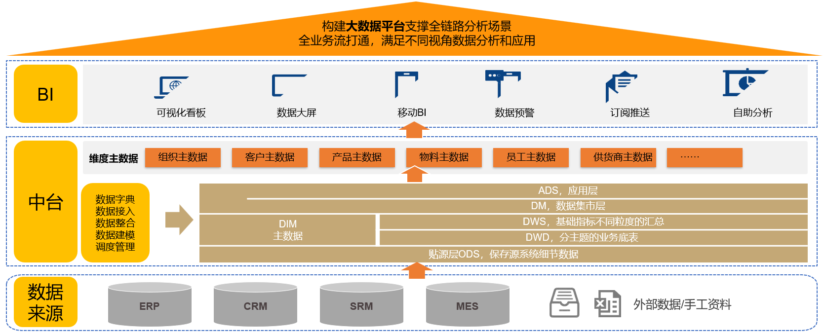不同的业务管理系统互相独立,且数据不统一:客户主数据、组织主数据、产品物料主数据都是各自为政,互不统一。这些问题导致企业各个业务系统互相孤立,成为数据孤岛,想要做全面数据分析,难上加难。而这就是中台BI平台的价值与优势。