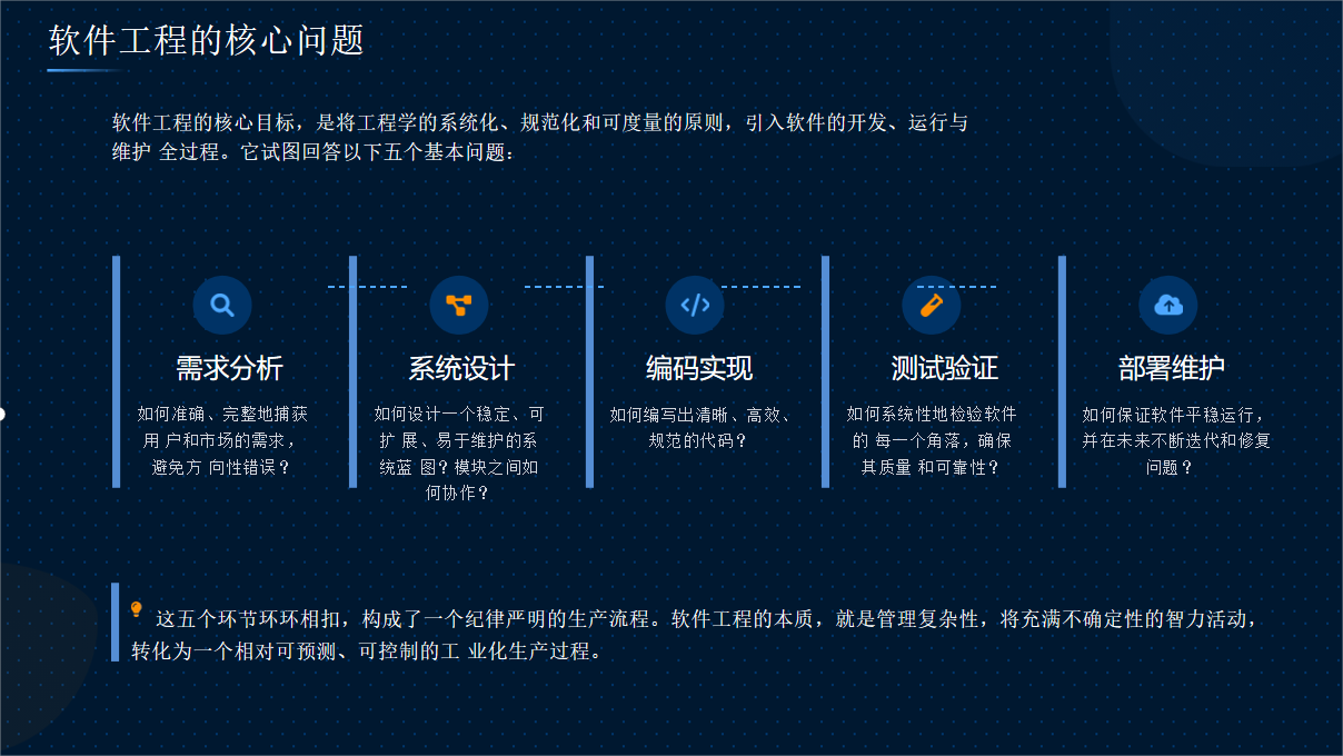 软件工程是将系统化的、规范化的、可量化的方法应用于软件的开发、运行和维护的过程。它不仅关注代码编写,更强调工程化的管理,以确保软件项目在预算、进度和质量三方面达到平衡。