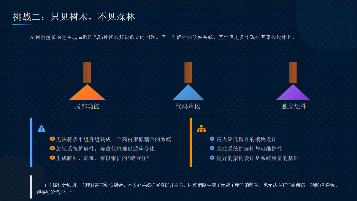目前的大部分AI在代码生成方面仍存在明显的碎片化特征,缺乏系统性的架构思维。AI工具通常会基于局部上下文生成代码建议,却难以把握整体系统的可扩展性和模块化要求,常常会产生违背"高内聚低耦合"原则的紧耦合代码。过多的碎片化代码可能会成为工程垃圾,引发系统性的质量问题。因此,开发团队必须认识到AI生成代码的这一局限性,始终将架构设计的主导权掌握在人类工程师手中,仅将AI作为实现细节的辅助工具,而非架构决策的替代者。