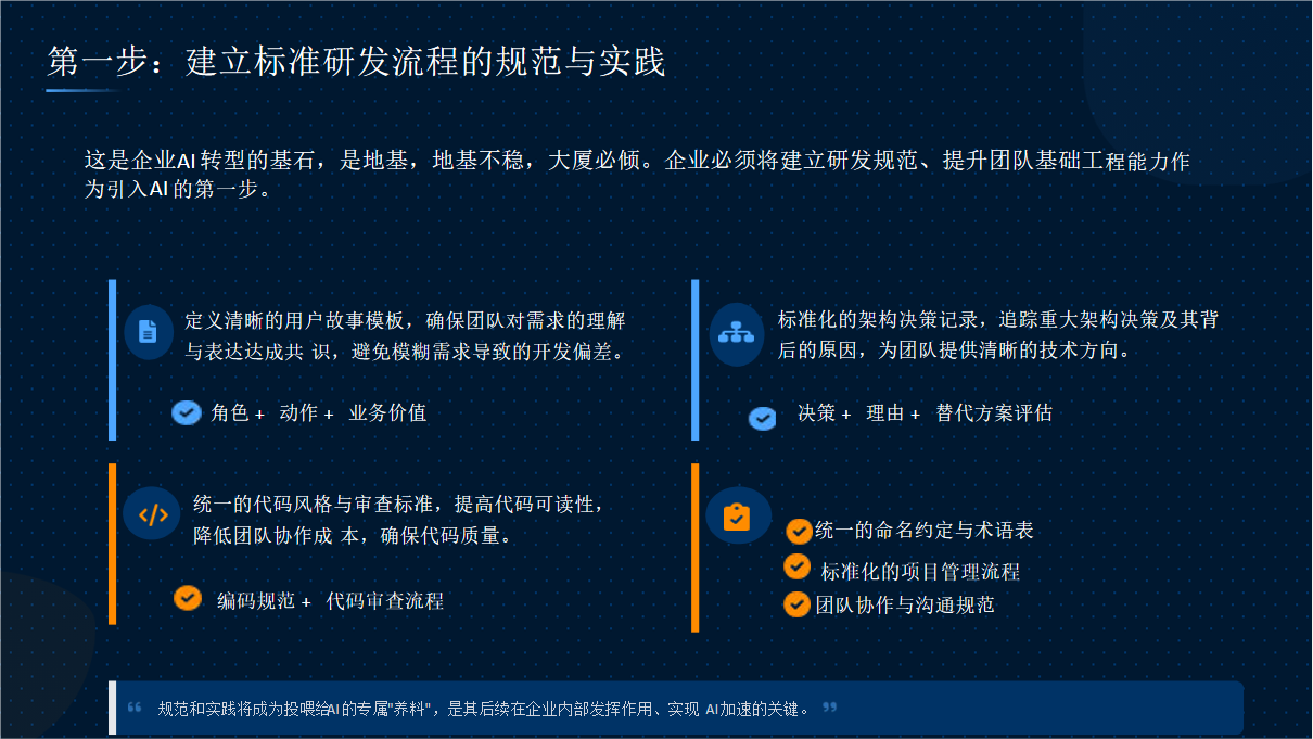 在AI融入软件工程研发的初期,企业必须首先建立标准化的研发流程,这是确保后续AI应用稳定性和有效性的基础。通过定义清晰的用户故事模板、统一代码风格与审查标准、记录架构决策以及规范团队协作方式,企业能够为AI工具提供结构化的输入环境。这一阶段的重点是消除流程中的模糊地带,使AI能够在明确的规则和框架下运行,避免因人为随意性导致AI输出不可控。