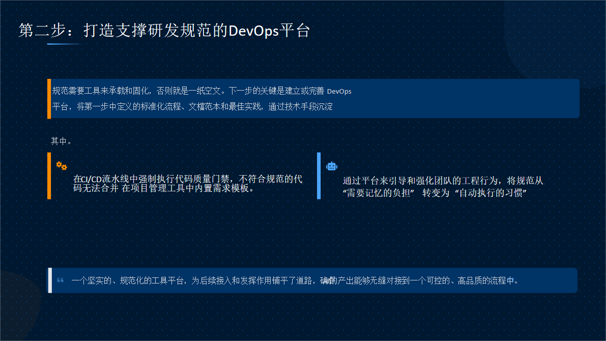 规范若缺乏工具支撑,便难以落地执行。因此,企业需要构建一个高度自动化的DevOps平台,将第一步定义的标准化流程通过技术手段固化。AI可以基于平台数据进行分析和优化,甚至直接调用工具链API执行部署任务。通过工具赋能,研发规范从“被动遵守”转变为“自动执行”,为AI的高效介入铺平道路。