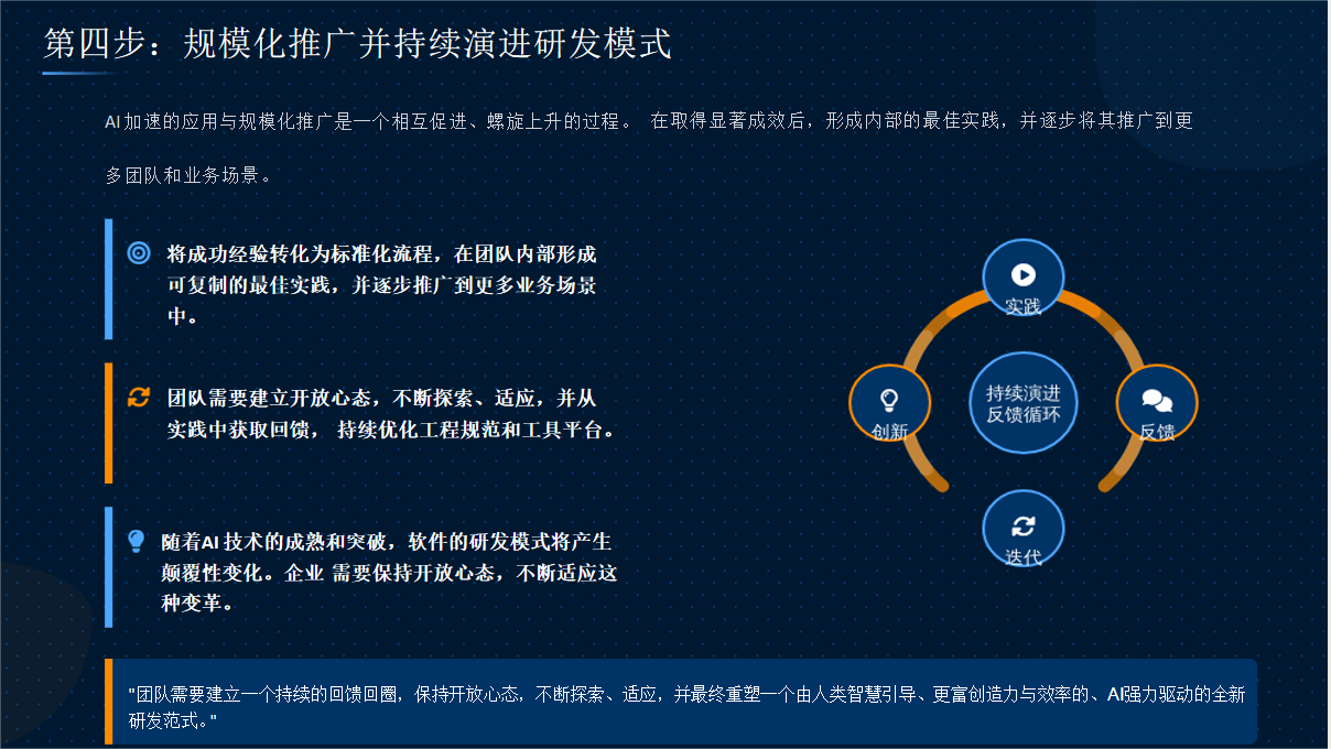 AI与研发流程的融合是一个动态迭代的过程。在局部试点取得成效后,企业需将成功经验转化为可复制的标准化实践,推广至更多团队和业务场景。同时,必须建立反馈机制,持续监控AI工具的实际效果,并根据反馈优化模型和流程。随着AI技术的演进(如多模态模型、自主Agent的出现),研发模式可能面临颠覆性变革,企业需保持开放心态,及时调整策略。