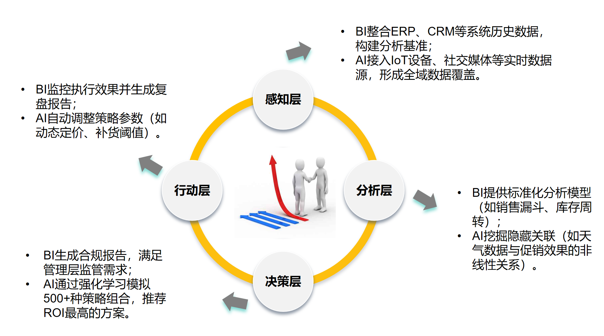德昂在实践中发现,AI与BI的协同可构建四层能力闭环:感知层->分析层->决策层->行动层