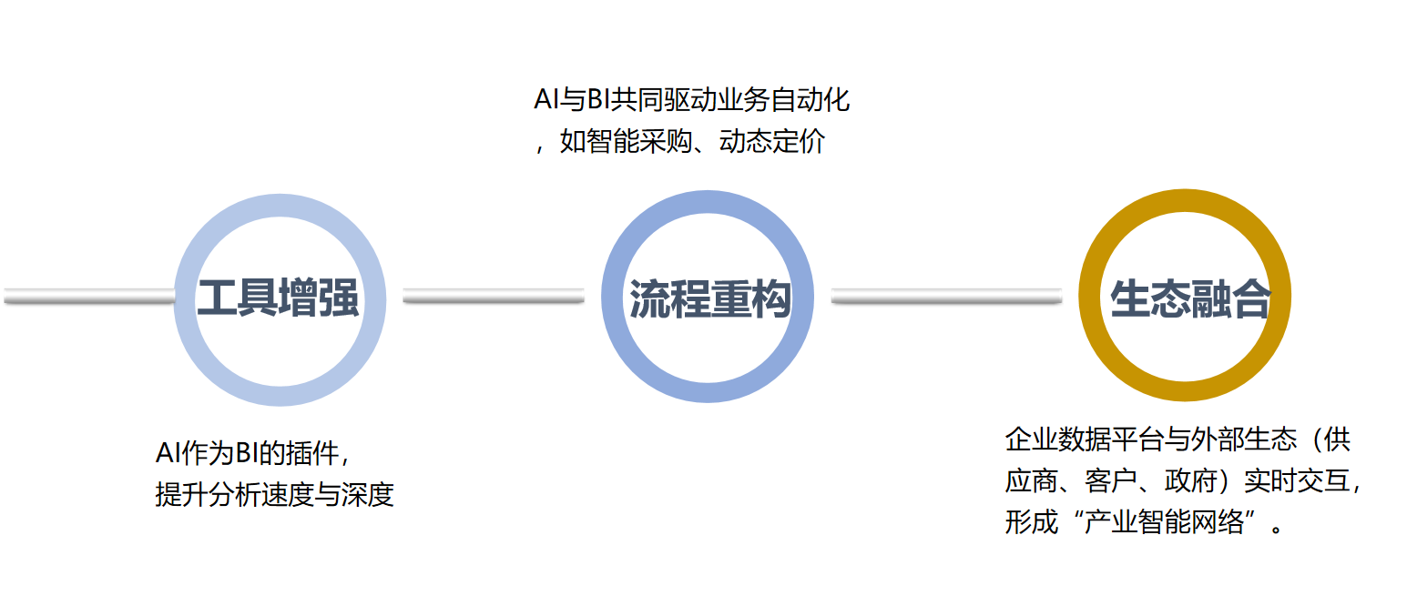 德昂预测AI与BI的协同将经历三个阶段:工具增强-->流程重构-->生态融合