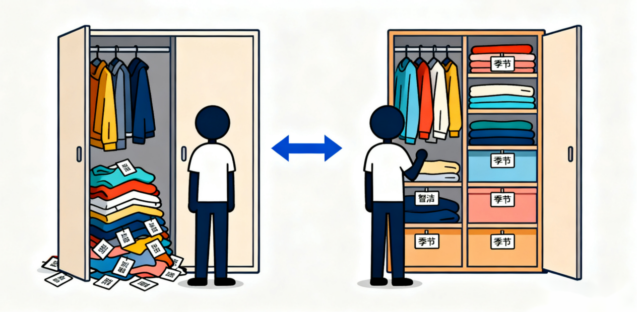 整理衣柜时,我们会熨平褶皱衣物、清洗脏衣、淘汰破损件、收纳过季衣 —— 目的是让衣物 “整洁、可用”。