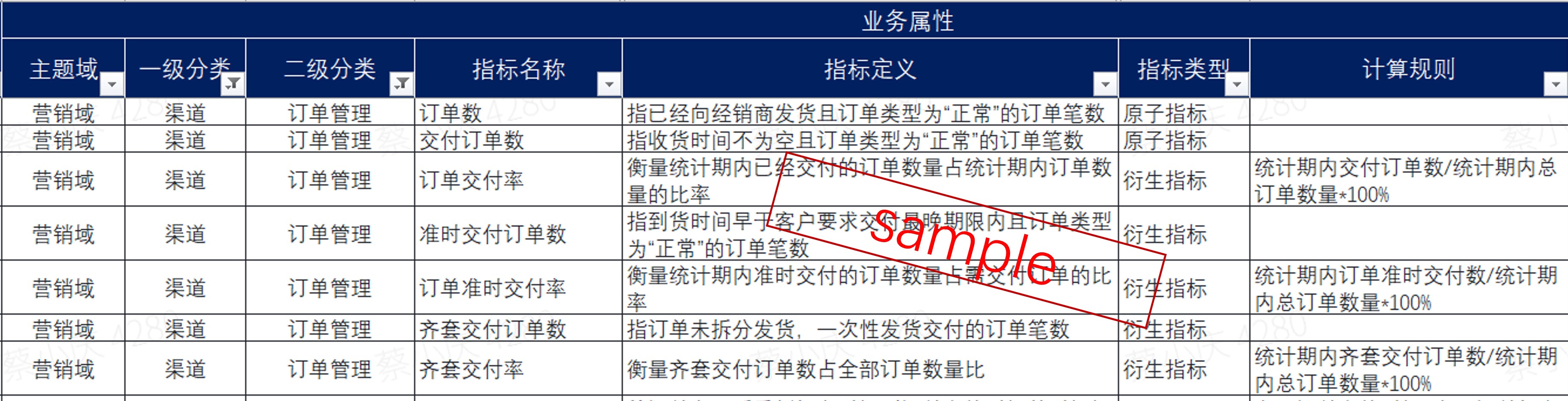指标定义:用精炼的业务语言描述指标的核心业务含义,如经销商采购数量指标含义为“指指公司在未来特定周期内(如季度、年度),为其经销商计划达成的采购数量所设定的任务值”。