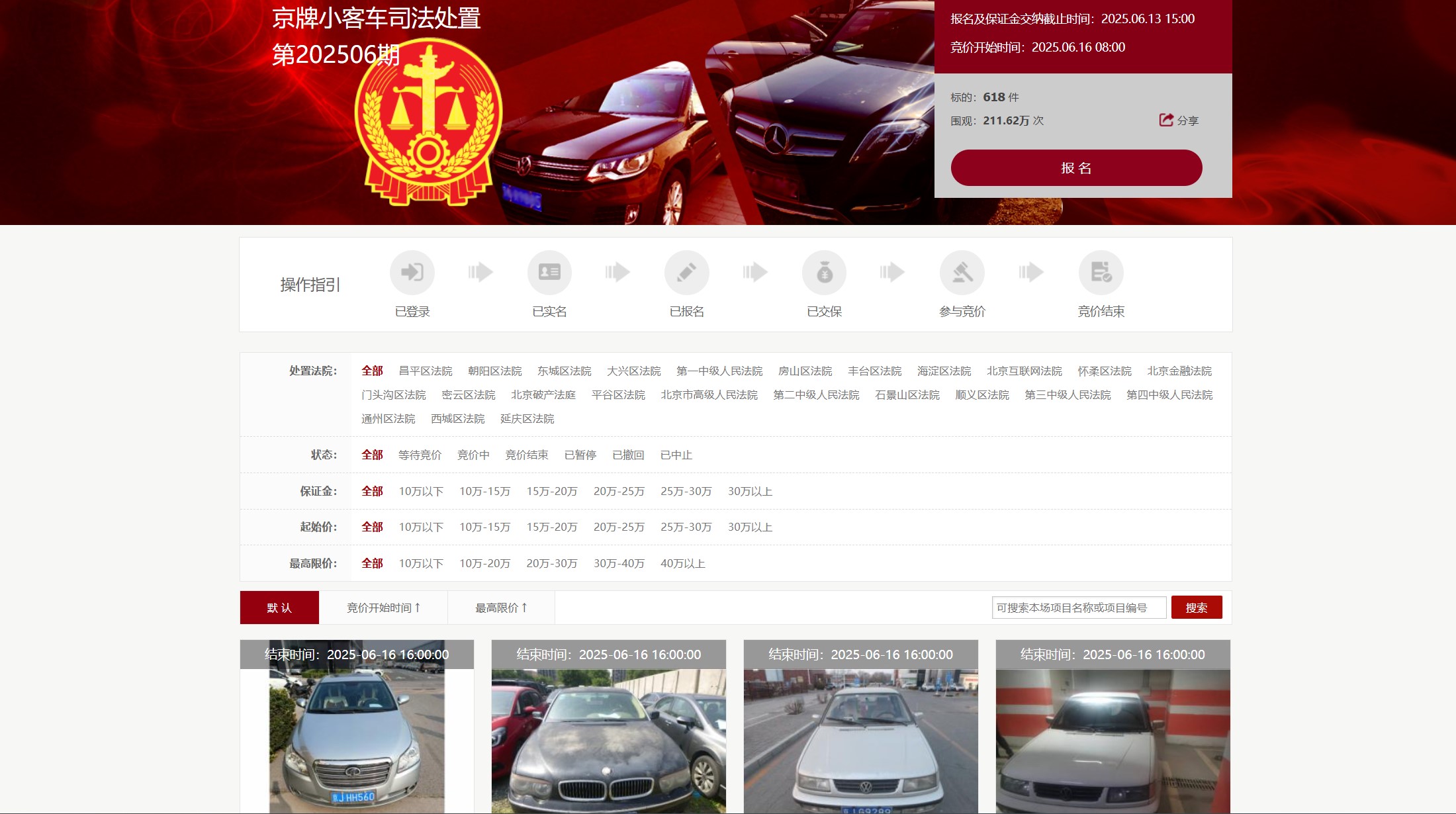 司法拍卖平台的数据往往分散在车辆基础信息页、竞拍结果页、评估报告页等多个页面,且存在表格与文本混杂的格式不统一问题,传统人工复制粘贴不仅效率低下,还易出现数据误差。本次分析的数据源来自北交互联 “京牌小客车司法处置网络平台” (如上图所示)(官方网址:https://jpxkc.cbex.com/page/jpxkc/s/index.html),聚焦 2025 年第 6 期拍卖数据(发布时间:2025 年 6 月 15 日 - 25 日),涵盖 618 辆拍卖车辆的详细信息(车型、品牌、登记日期、起拍价、评估价、行驶里程等)及最终成交结果(成交价、竞拍次数等)。
