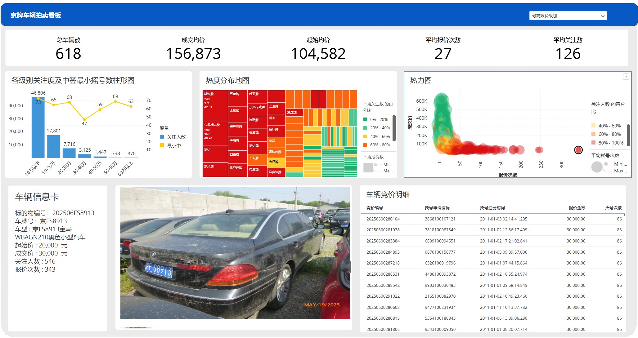 在北京,车牌指标始终是稀缺资源 ——2025 年普通小客车指标年度配额仅 10 万个(其中普通指标 3 万个、新能源指标 7 万个),而截至 2024 年底,全市机动车保有量已攀升至 710 万辆(数据来源:北京市交通委 2025 年 1 月发布会)。对于急需获取京牌的个人与企业来说,司法处置渠道成为重要补充路径。本文以北京京牌小客车司法处置第 202506 期拍卖数据为核心案例,详细展示如何通过 德昂RPA(机器人流程自动化)自动抓取数据与德昂BI(商业智能)可视化分析的组合,从海量信息中挖掘关键商业洞察