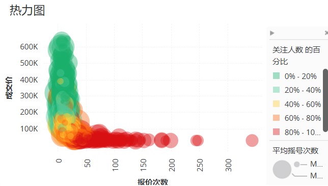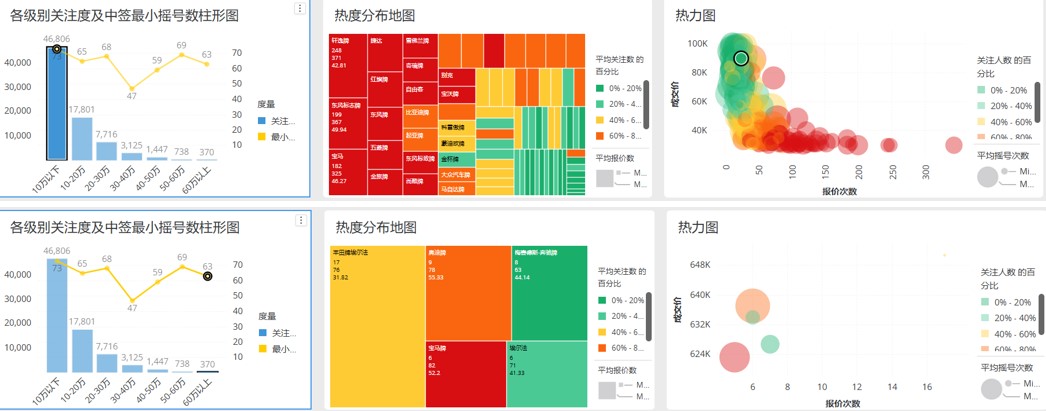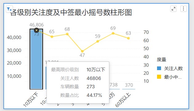 竞拍热度:整体呈现 “成交价越高,关注人数越少” 的特征,大部分用户的关注与竞拍焦点集中在 10 万元以下车型。同时,报价次数和成交价越高,平均摇号次数越低(如下图所示)。此外,可通过最高限价区间分布,联动查看不同价格区间内车辆的竞拍热度,进一步细化分析维度。