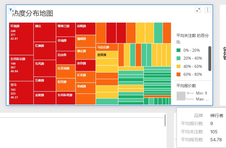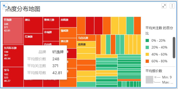 品牌热度:轩逸热度最高,其平均报价数居首,平均关注数占比更超 80%(如下图所示);反观神行者,品牌热度最低,关注度与报价次数均处于低位(如下图所示)。从竞拍策略来看,选择神行者这类冷门车型,因参与竞拍人数较少,可有效提升竞拍成功几率。